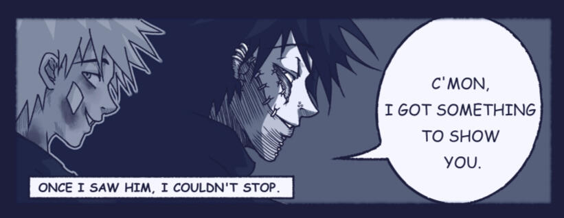 โYou came,โ he murmurs, tilting his chin up. A smile stretches across his face and causes the staples at the corner of his mouth to creak. His left knee keeps bouncing up and down, heโs jittery. โI knew youโd come for me.โspot and page illustrations by ElegiesForShiva